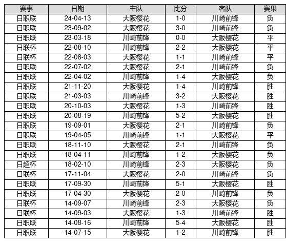 川崎前锋 VS 大阪樱花两队近10年的交战次数为23场,川崎前锋8胜4平11负,赢球概率为34.8%,平局概率为17.4%,输球概率为47.8%。