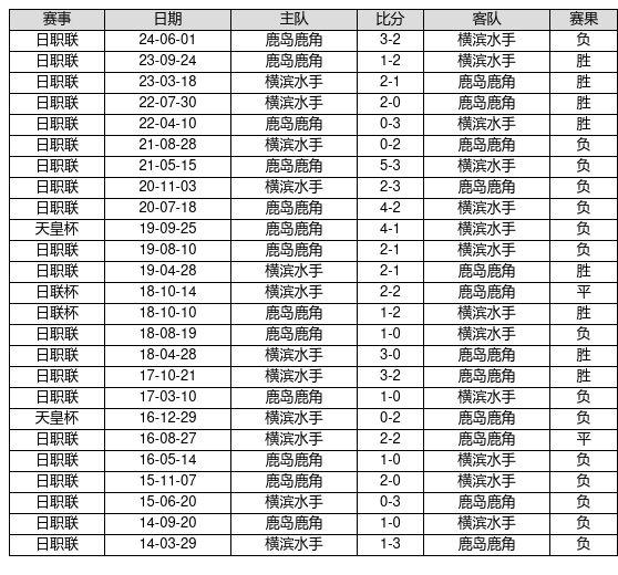 横滨水手 VS 鹿岛鹿角两队近10年的交战次数为25场,横滨水手8胜2平15负,赢球概率为32.0%,平局概率为8.0%,输球概率为60.0%。