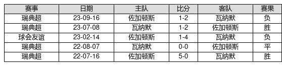 佐加顿斯 VS 瓦纳默两队近10年的交战次数为5场,佐加顿斯2胜1平2负,赢球概率为40.0%,平局概率为20.0%,输球概率为40.0%。