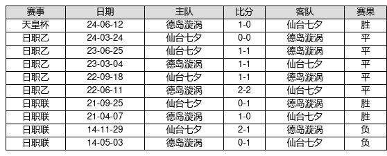 德岛漩涡 VS 仙台七夕两队近10年的交战次数为10场,德岛漩涡3胜5平2负,赢球概率为30.0%,平局概率为50.0%,输球概率为20.0%。