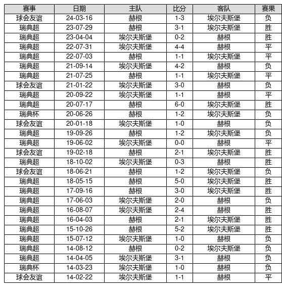 赫根 VS 埃尔夫斯堡两队近10年的交战次数为28场,赫根10胜6平12负,赢球概率为35.7%,平局概率为21.4%,输球概率为42.9%。