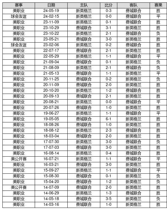 费城联合 VS 新英格兰两队近10年的交战次数为35场,费城联合20胜7平8负,赢球概率为57.1%,平局概率为20.0%,输球概率为22.9%。