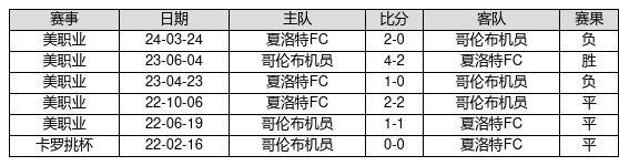 哥伦布机员 VS 夏洛特FC两队近10年的交战次数为6场,哥伦布机员1胜3平2负,赢球概率为16.7%,平局概率为50.0%,输球概率为33.3%。