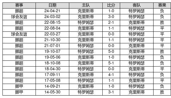 特罗姆瑟 VS 克里斯蒂两队近10年的交战次数为15场,特罗姆瑟3胜6平6负,赢球概率为20.0%,平局概率为40.0%,输球概率为40.0%。