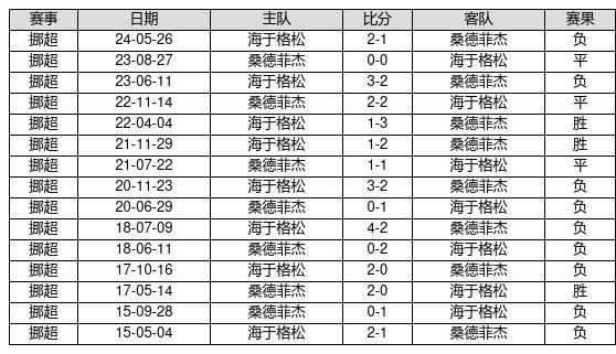 桑德菲杰 VS 海于格松两队近10年的交战次数为15场,桑德菲杰3胜3平9负,赢球概率为20.0%,平局概率为20.0%,输球概率为60.0%。
