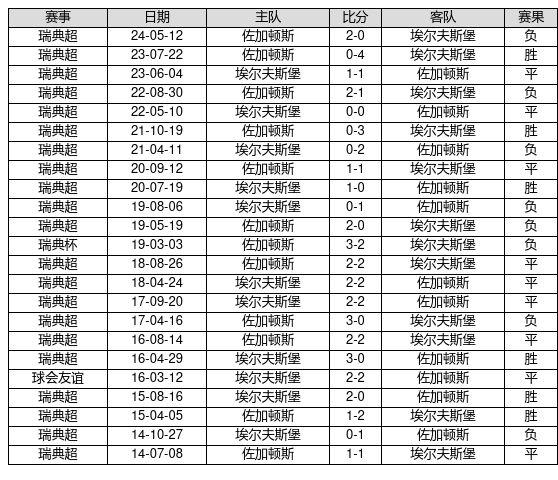 埃尔夫斯堡 VS 佐加顿斯两队近10年的交战次数为23场,埃尔夫斯堡6胜9平8负,赢球概率为26.1%,平局概率为39.1%,输球概率为34.8%。
