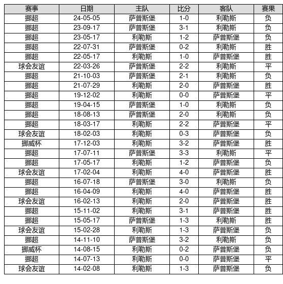 利勒斯 VS 萨普斯堡两队近10年的交战次数为27场,利勒斯9胜5平13负,赢球概率为33.3%,平局概率为18.5%,输球概率为48.1%。