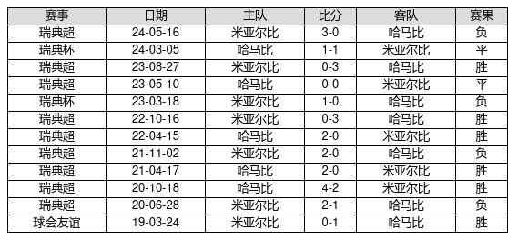 哈马比 VS 米亚尔比两队近10年的交战次数为12场,哈马比6胜2平4负,赢球概率为50.0%,平局概率为16.7%,输球概率为33.3%。