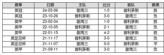 谢周三 VS 普利茅斯两队近10年的交战次数为8场,谢周三3胜1平4负,赢球概率为37.5%,平局概率为12.5%,输球概率为50.0%。