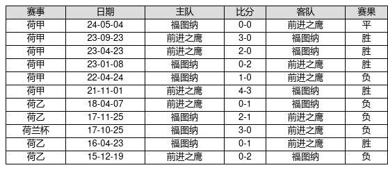 前进之鹰 VS 福图纳两队近10年的交战次数为11场,前进之鹰5胜1平5负,赢球概率为45.5%,平局概率为9.1%,输球概率为45.5%。
