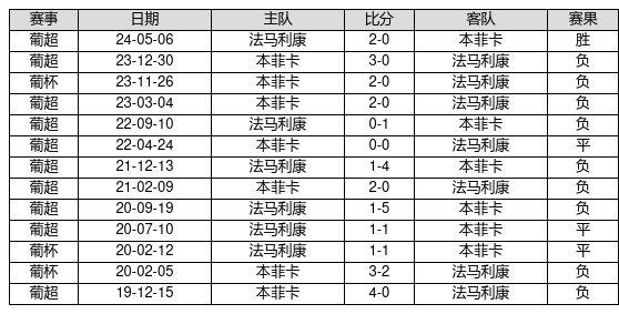 法马利康 VS 本菲卡两队近10年的交战次数为13场,法马利康1胜3平9负,赢球概率为7.7%,平局概率为23.1%,输球概率为69.2%。
