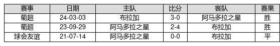 布拉加 VS 阿马多拉之星两队近10年的交战次数为3场,布拉加2胜1平0负,赢球概率为66.7%,平局概率为33.3%,输球概率为0.0%。