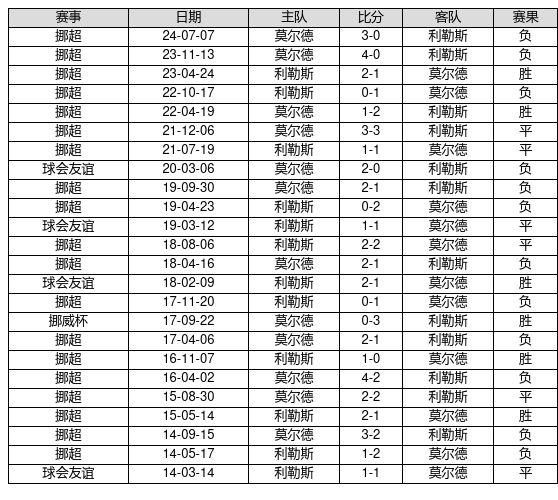 利勒斯 VS 莫尔德两队近10年的交战次数为24场,利勒斯6胜6平12负,赢球概率为25.0%,平局概率为25.0%,输球概率为50.0%。