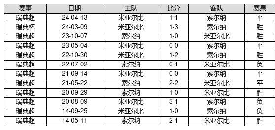 索尔纳 VS 米亚尔比两队近10年的交战次数为12场,索尔纳5胜4平3负,赢球概率为41.7%,平局概率为33.3%,输球概率为25.0%。