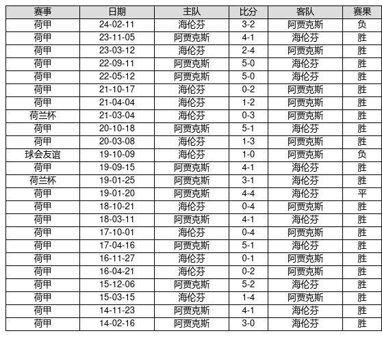 阿贾克斯 VS 海伦芬两队近10年的交战次数为24场,阿贾克斯21胜1平2负,赢球概率为87.5%,平局概率为4.2%,输球概率为8.3%。