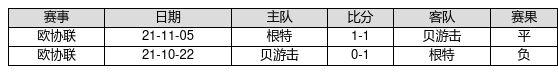 贝游击 VS 根特两队近10年的交战次数为2场,贝游击0胜1平1负,赢球概率为0.0%,平局概率为50.0%,输球概率为50.0%。