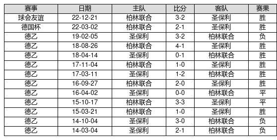 柏林联合 VS 圣保利两队近10年的交战次数为13场,柏林联合8胜2平3负,赢球概率为61.5%,平局概率为15.4%,输球概率为23.1%。