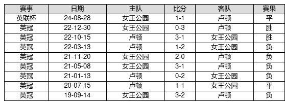 卢顿 VS 女王公园两队近10年的交战次数为9场,卢顿2胜2平5负,赢球概率为22.2%,平局概率为22.2%,输球概率为55.6%。