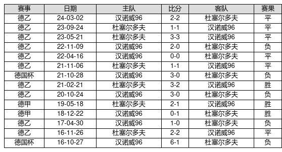 杜塞尔多夫 VS 汉诺威96两队近10年的交战次数为14场,杜塞尔多夫3胜6平5负,赢球概率为21.4%,平局概率为42.9%,输球概率为35.7%。