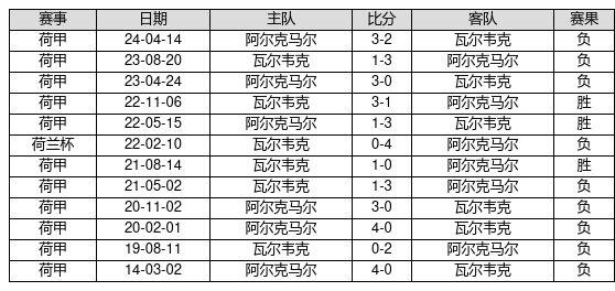 瓦尔韦克 VS 阿尔克马尔两队近10年的交战次数为12场,瓦尔韦克3胜0平9负,赢球概率为25.0%,平局概率为0.0%,输球概率为75.0%。