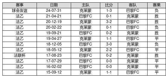 克莱蒙 VS 巴黎FC两队近10年的交战次数为12场,克莱蒙4胜5平3负,赢球概率为33.3%,平局概率为41.7%,输球概率为25.0%。