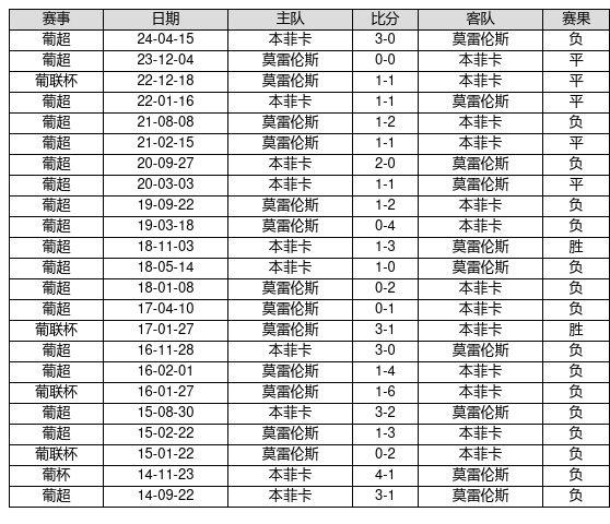 莫雷伦斯 VS 本菲卡两队近10年的交战次数为23场,莫雷伦斯2胜5平16负,赢球概率为8.7%,平局概率为21.7%,输球概率为69.6%。