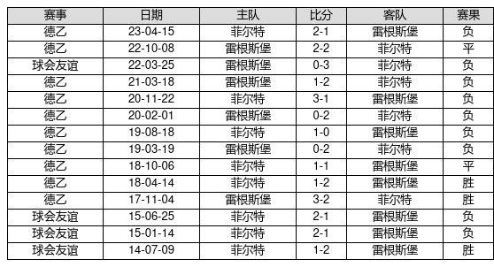 雷根斯堡 VS 菲尔特两队近10年的交战次数为14场,雷根斯堡3胜2平9负,赢球概率为21.4%,平局概率为14.3%,输球概率为64.3%。