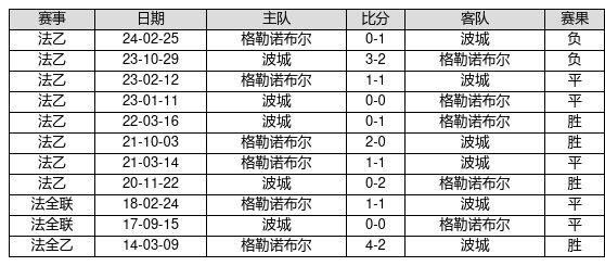 格勒诺布尔 VS 波城两队近10年的交战次数为11场,格勒诺布尔4胜5平2负,赢球概率为36.4%,平局概率为45.5%,输球概率为18.2%。