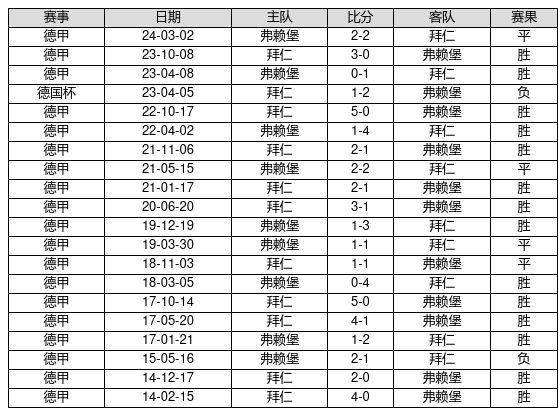拜仁 VS 弗赖堡两队近10年的交战次数为20场,拜仁14胜4平2负,赢球概率为70.0%,平局概率为20.0%,输球概率为10.0%。