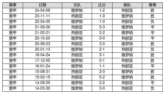 热那亚 VS 维罗纳两队近10年的交战次数为15场,热那亚7胜5平3负,赢球概率为46.7%,平局概率为33.3%,输球概率为20.0%。