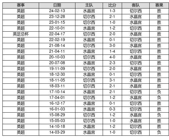 切尔西 VS 水晶宫两队近10年的交战次数为22场,切尔西18胜0平4负,赢球概率为81.8%,平局概率为0.0%,输球概率为18.2%。