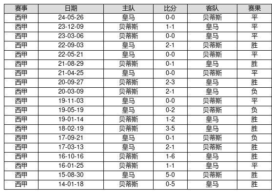 皇马 VS 贝蒂斯两队近10年的交战次数为19场,皇马9胜7平3负,赢球概率为47.4%,平局概率为36.8%,输球概率为15.8%。