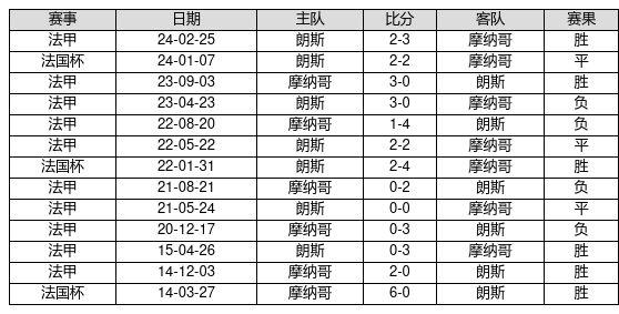 摩纳哥 VS 朗斯两队近10年的交战次数为13场,摩纳哥6胜3平4负,赢球概率为46.2%,平局概率为23.1%,输球概率为30.8%。
