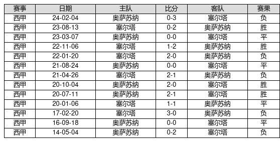 奥萨苏纳 VS 塞尔塔两队近10年的交战次数为13场,奥萨苏纳4胜4平5负,赢球概率为30.8%,平局概率为30.8%,输球概率为38.5%。