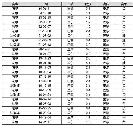 里尔 VS 巴黎两队近10年的交战次数为26场,里尔3胜4平19负,赢球概率为11.5%,平局概率为15.4%,输球概率为73.1%。