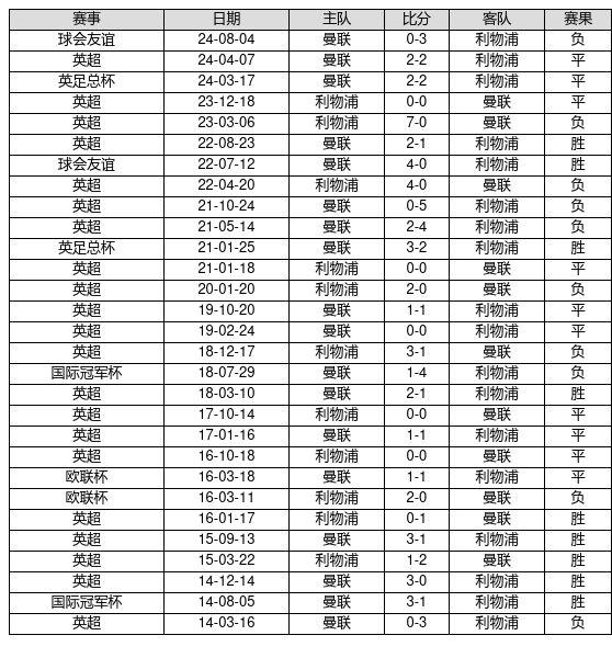 曼联 VS 利物浦两队近10年的交战次数为29场,曼联9胜10平10负,赢球概率为31.0%,平局概率为34.5%,输球概率为34.5%。