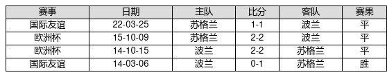 苏格兰 VS 波兰两队近10年的交战次数为4场,苏格兰1胜3平0负,赢球概率为25.0%,平局概率为75.0%,输球概率为0.0%。