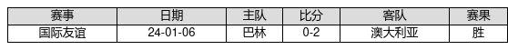 澳大利亚 VS 巴林两队近10年的交战次数为1场,澳大利亚1胜0平0负,赢球概率为100.0%,平局概率为0.0%,输球概率为0.0%。