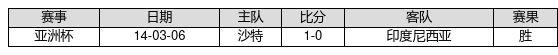 沙特 VS 印度尼西亚两队近10年的交战次数为1场,沙特1胜0平0负,赢球概率为100.0%,平局概率为0.0%,输球概率为0.0%。