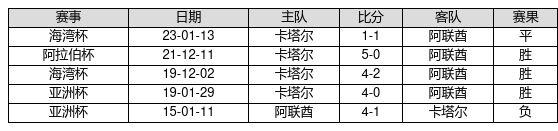 卡塔尔 VS 阿联酋两队近10年的交战次数为5场,卡塔尔3胜1平1负,赢球概率为60.0%,平局概率为20.0%,输球概率为20.0%。