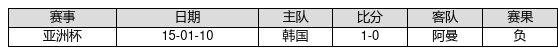 阿曼 VS 韩国两队近10年的交战次数为1场,阿曼0胜0平1负,赢球概率为0.0%,平局概率为0.0%,输球概率为100.0%。