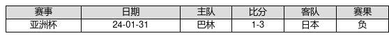 巴林 VS 日本两队近10年的交战次数为1场,巴林0胜0平1负,赢球概率为0.0%,平局概率为0.0%,输球概率为100.0%。