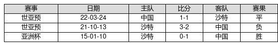 中国 VS 沙特两队近10年的交战次数为3场,中国1胜1平1负,赢球概率为33.3%,平局概率为33.3%,输球概率为33.3%。