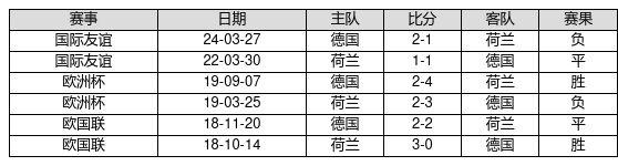 荷兰 VS 德国两队近10年的交战次数为6场,荷兰2胜2平2负,赢球概率为33.3%,平局概率为33.3%,输球概率为33.3%。