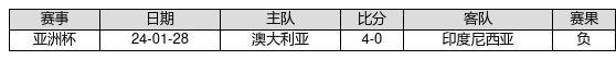 印度尼西亚 VS 澳大利亚两队近10年的交战次数为1场,印度尼西亚0胜0平1负,赢球概率为0.0%,平局概率为0.0%,输球概率为100.0%。
