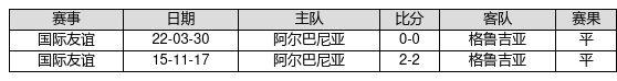 阿尔巴尼亚 VS 格鲁吉亚两队近10年的交战次数为2场,阿尔巴尼亚0胜2平0负,赢球概率为0.0%,平局概率为100.0%,输球概率为0.0%。