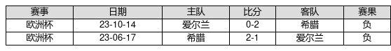 爱尔兰 VS 希腊两队近10年的交战次数为2场,爱尔兰0胜0平2负,赢球概率为0.0%,平局概率为0.0%,输球概率为100.0%。