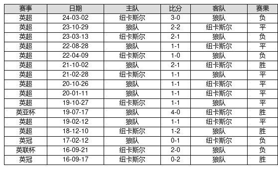 狼队 VS 纽卡斯尔两队近10年的交战次数为16场,狼队4胜7平5负,赢球概率为25.0%,平局概率为43.8%,输球概率为31.2%。