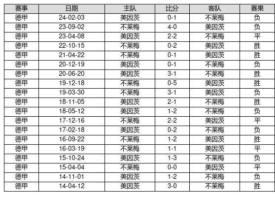 美因茨 VS 不莱梅两队近10年的交战次数为19场,美因茨7胜4平8负,赢球概率为36.8%,平局概率为21.1%,输球概率为42.1%。