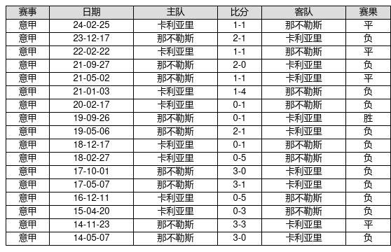卡利亚里 VS 那不勒斯两队近10年的交战次数为17场,卡利亚里1胜4平12负,赢球概率为5.9%,平局概率为23.5%,输球概率为70.6%。